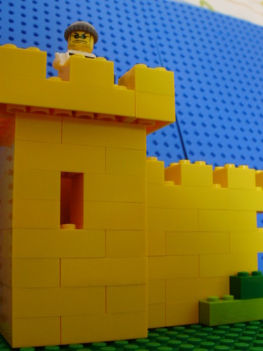 Parte de uma muralha de um castelo feita com peças de LEGO.